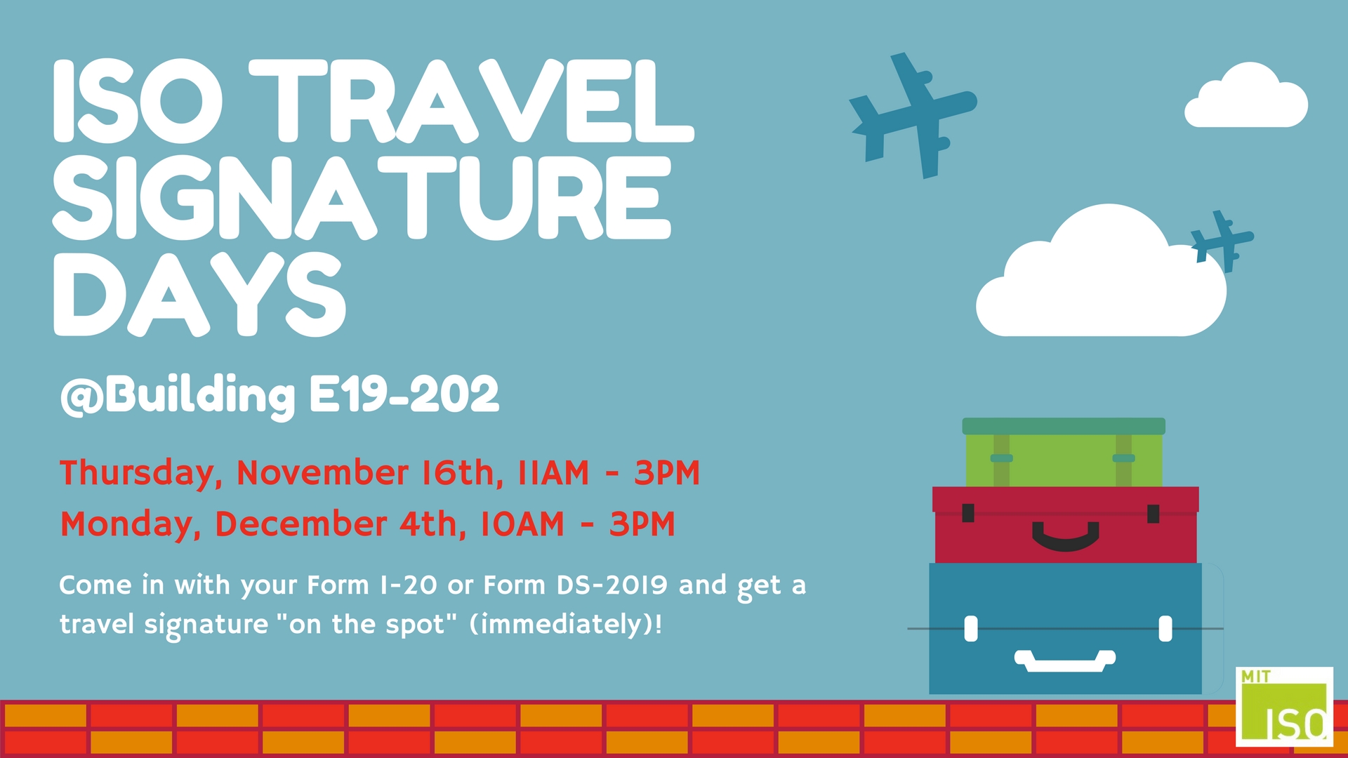 Stop by the ISO with your Form I-20 of Form DS-2019 and get a travel signature "on the spot" (immediately)!
