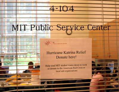 Public Service Center (PSC) The final date for PSC collections for local aid organizations and the Red Cross is September 30. We will continue to accept donations to enable MIT students to work with remediation efforts in the Gulf area until January. Checks can be made out to MIT, and donors who contribute more than $250 will receive an acknowledgement letter for tax purposes from the MIT Treasurer's Office. Donations can also be made online through the alumni association. The PSC is interested in helping to plan and coordinate other efforts, so please let them know if you are planning an event. Contact Sally Susnowitz at susnowit@mit.edu or 617-258-7344. Student groups MIT students who wish to support student initiatives can volunteer for food drives, cash/TechCash collection, a fundraiser dinner on September 17 in La Sala, a benefit concert with Berklee College of Music, student service projects (in collaboration with the PSC), corporate solicitations, and more. Contact Aston Motes (aston at mit dot edu) or Louis Fouche (fouche07 at mit dot edu). See also student initiatives. Personal Leave for Staff Volunteers There has been an outpouring of ideas and offers from members of the MIT community to help with the hurricane relief efforts, both on campus and in the communities most affected. MIT will grant leaves of absence to those members of the staff who wish to volunteer their time and skills to support the hurricane relief efforts of recognized organizations, depending on the needs of their office or work unit. As with any time off, those wishing to take time away from MIT in order to help with relief efforts should submit such requests to their supervisors. People also may choose to use accrued vacation time to cover some or all of the time away. The form for requesting personal leave can be found on the web at: http://web.mit.edu/hr/fmla/forms/request.doc (MS Word). For further information on MIT's policy regarding unpaid leave, please see Section 4.16.1 of MIT's Personnel Policy Manual.