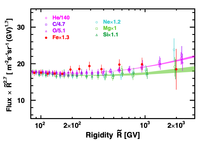 Figure 2. The rigidity dependence of the primary cosmic nuclei Ne, Mg, and Si fluxes compared to rigidity dependence of the primary He, C, O and Fe fluxes. This shows two distinct subclasses of primary cosmic rays. Surprisingly, Fe belongs to the light subclass of primary cosmic rays.