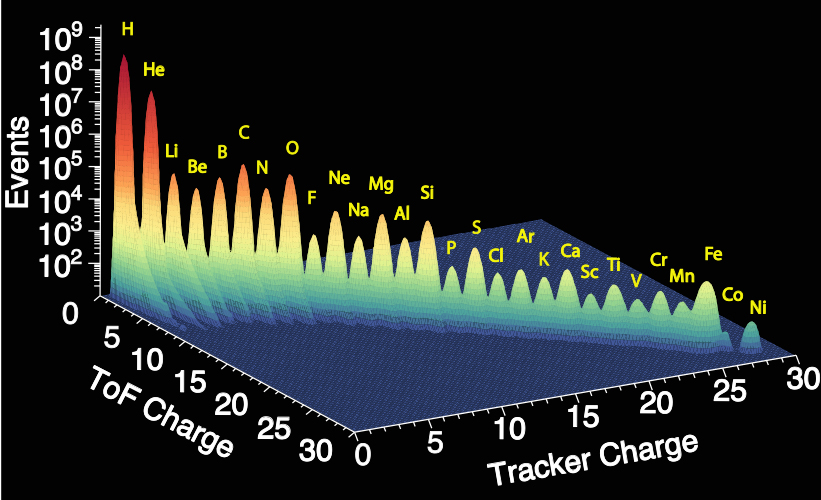 Figure 3. AMS measurements of the charge of cosmic rays using the time of flight detector (TOF) and the silicon tracker. As seen, AMS is measuring radiation of all cosmic ray nuclei up to iron and above.