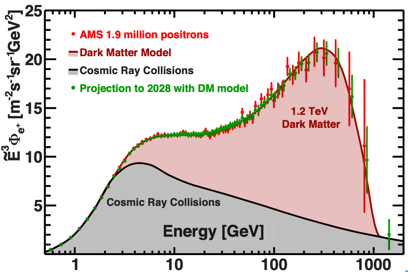 Figure 4. The positron spectrum measured by AMS. Also shown are the expected positron flux from the collision of cosmic rays with the interstellar medium and a model predicting an additional contribution of positrons from dark matter annihilations. Projection of the AMS results to 2028 is also shown.