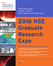 NSE’s 2016 Graduate Research Expo was held on March 11 and kicked off MIT’s visit weekend for prospective graduate students. The event provides a unique opportunity for the visitors and MIT community to learn more about the diverse research being conducted within NSE by faculty and graduate students. The topics in the 2016 Expo ranged from developing new algorithms for efficient computational modeling of reactors to characterizing the heat transfer at the clad-coolant interface, to modeling the material properties of molten salt coolants for advanced reactor designs. The breadth of projects captured the interdisciplinary nature of nuclear science and engineering, which sits at the intersection of material science, mechanical engineering, physics, and computer science. Along with a poster session three students — Alexandre Guion, Brandon Sorbom, and Lixin Sun — spoke about their research.